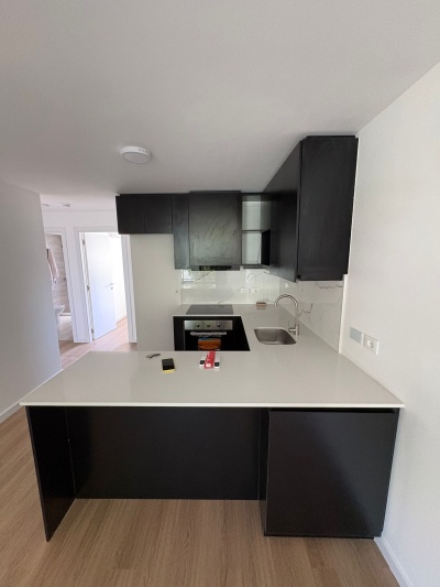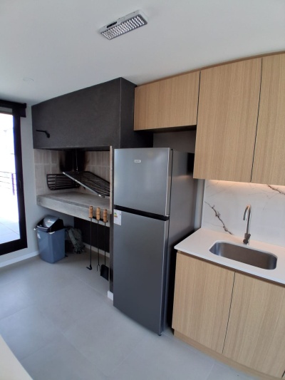 Cocina integrada, con profusión de placares sobre y bajo mesada, barra desayunadora también con placares. Equipada con anafe de cuatro fuegos y horno eléctricos. Campana extractora. Calefón ya instalado en placard y conexión para lavarropas.