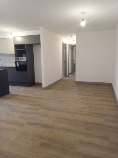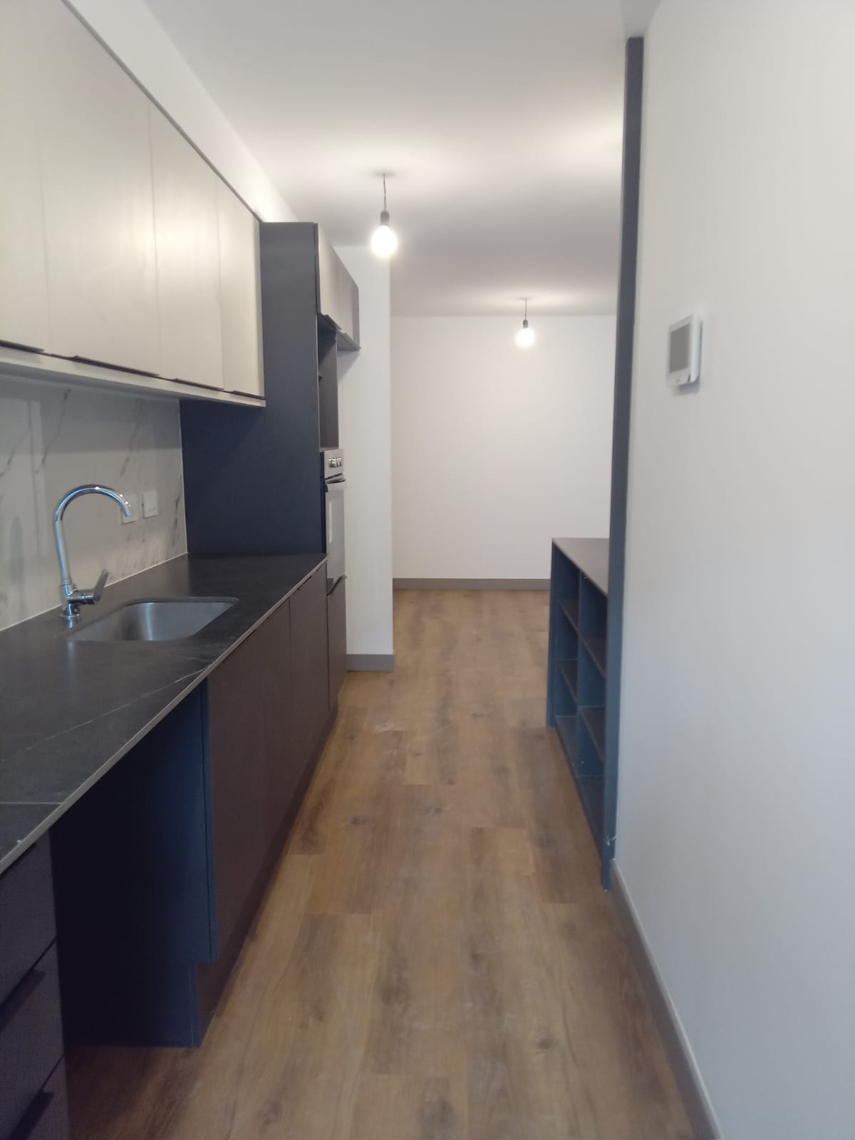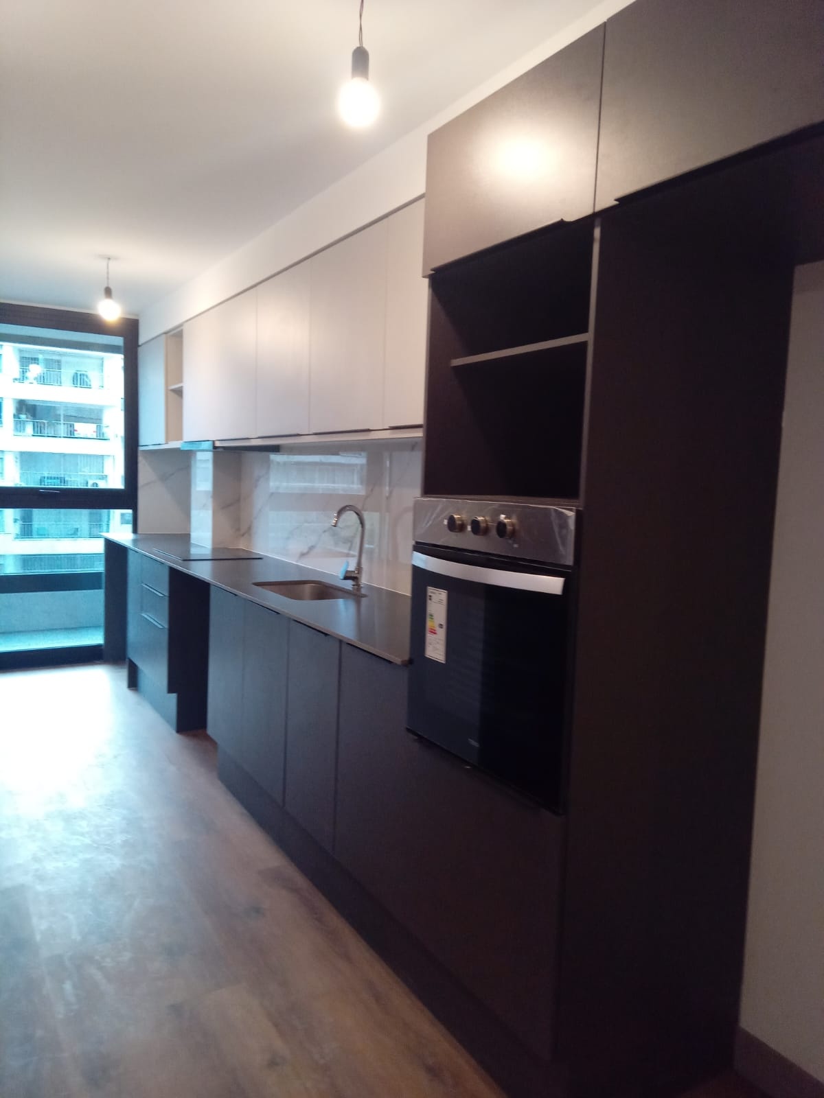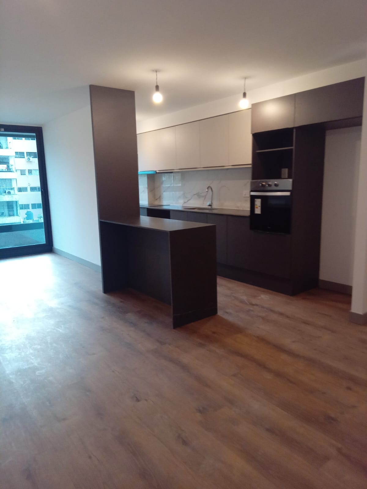 Cocina semi-integrada, barra de apoyo, con placares sobre y bajo mesada y equipada con anafe, horno y campana extractora.